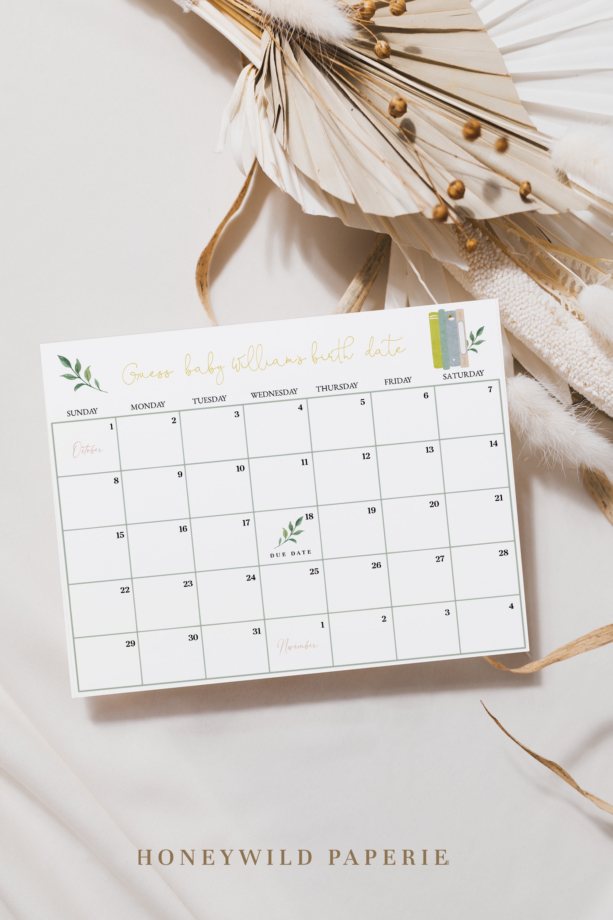 Personalised guess the arrival date game sage green baby shower game