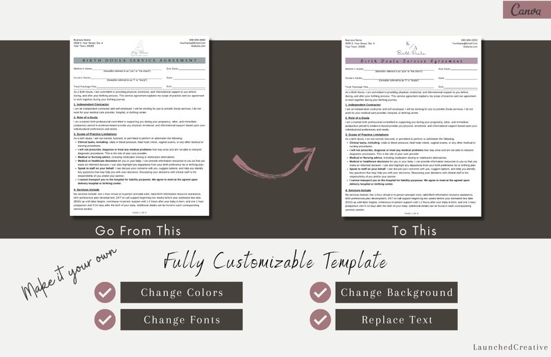 DIY Birth Doula Contracts EDITABLE Doula Contract Canva Template