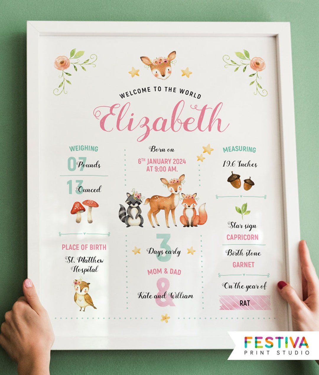 Birth Stats Printable Wall Art Baby Girl Birth Stats Woodland Animals