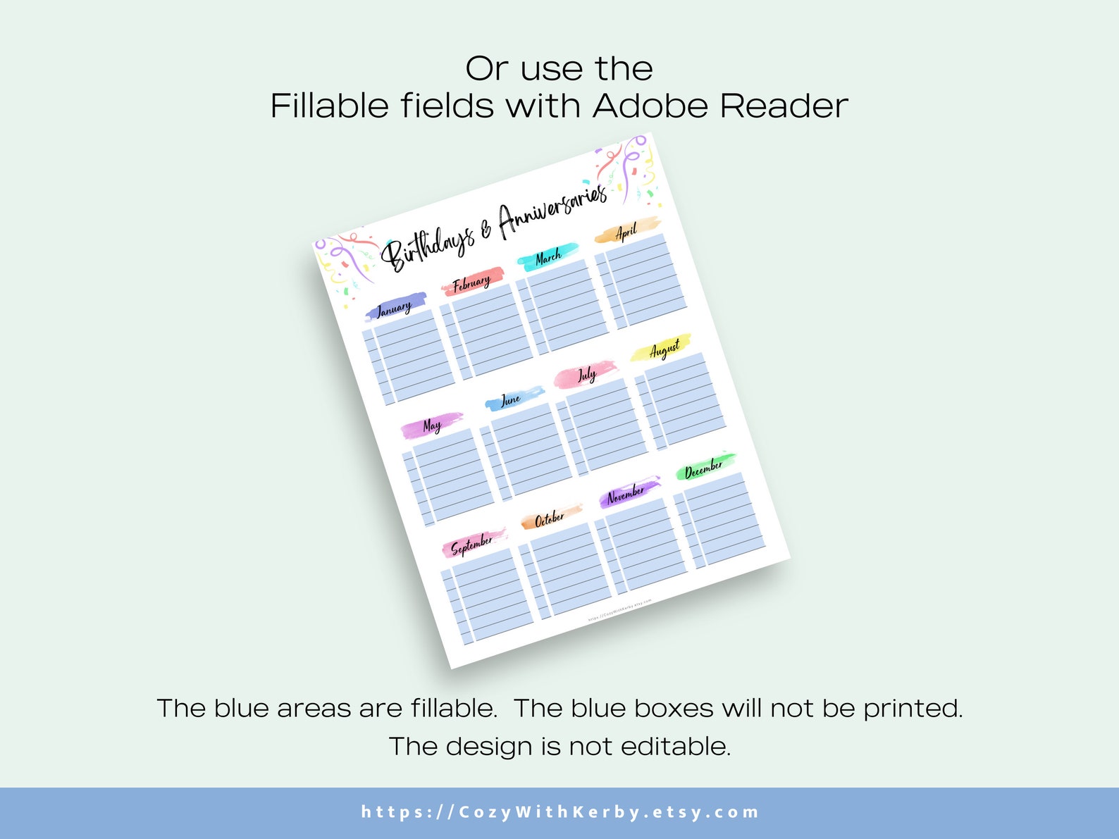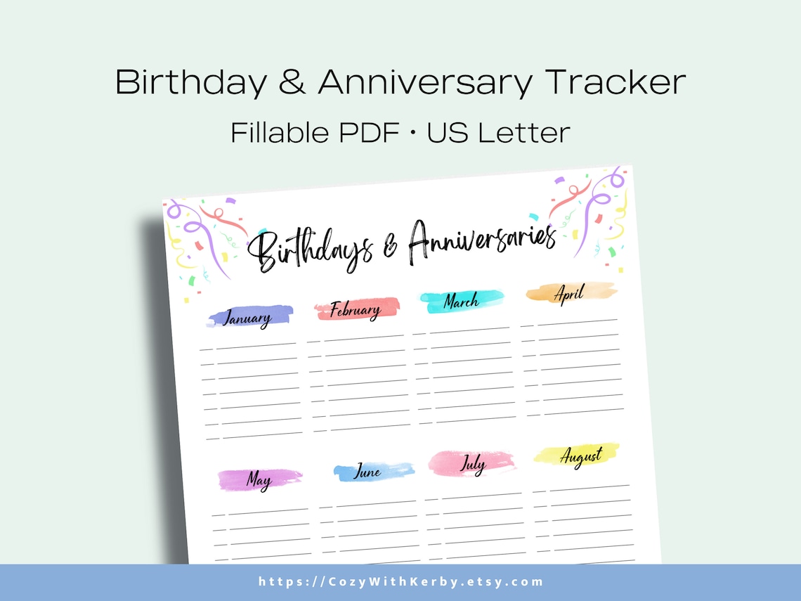 Birthday Anniversary Tracker Printable Fillable PDF Birthday Calendar