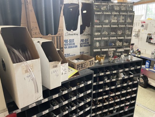 SHELF OF ASSORTED HARDWARE PARTS BINS TRUCK PARTS