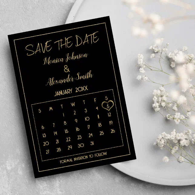 Luxury Simple Black Gold Calendar Save the Date Announcement Postcard