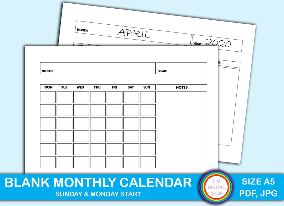Monthly Calendar Template Monthly Blank Calendar Monthly Etsy