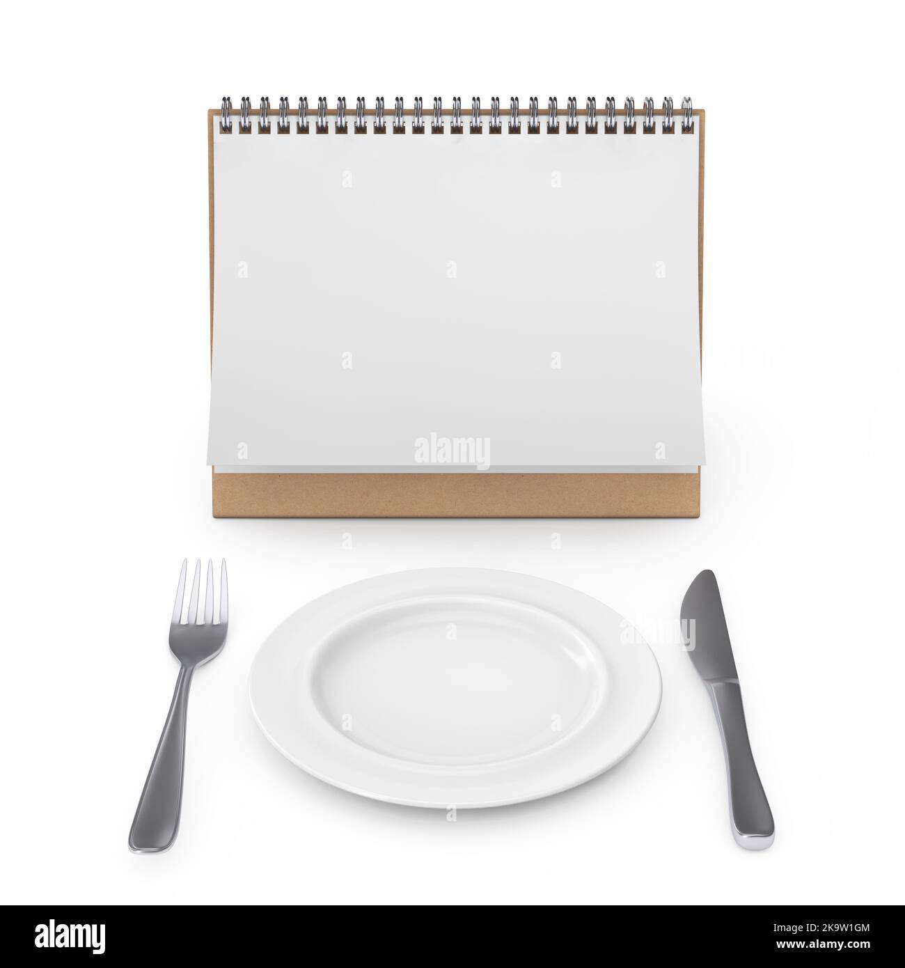 Blank Desk Calendar near Fork Knife and Empty Plate on a white
