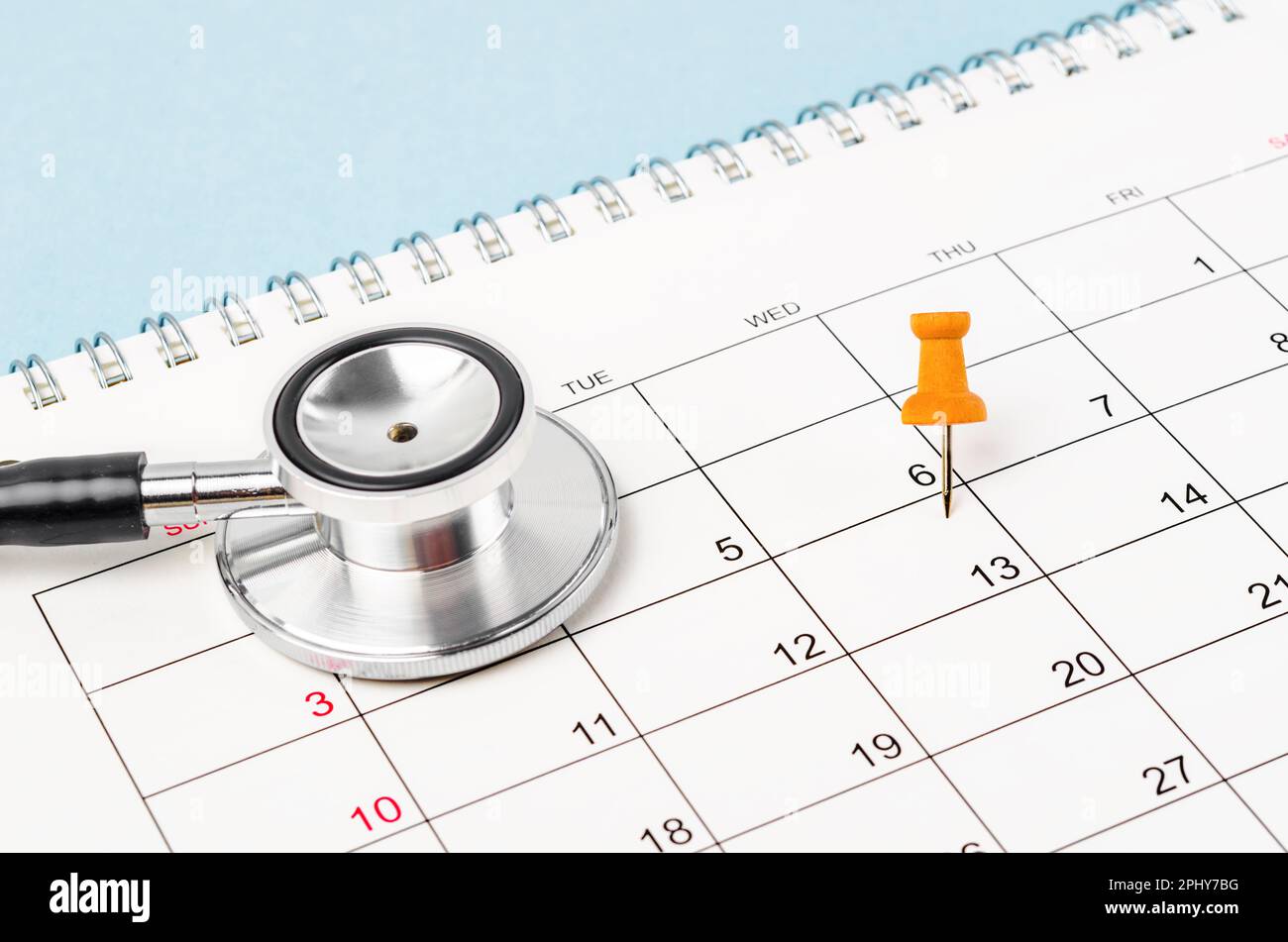 Stethoscope medical and blank desk calendar with wooden push pin on