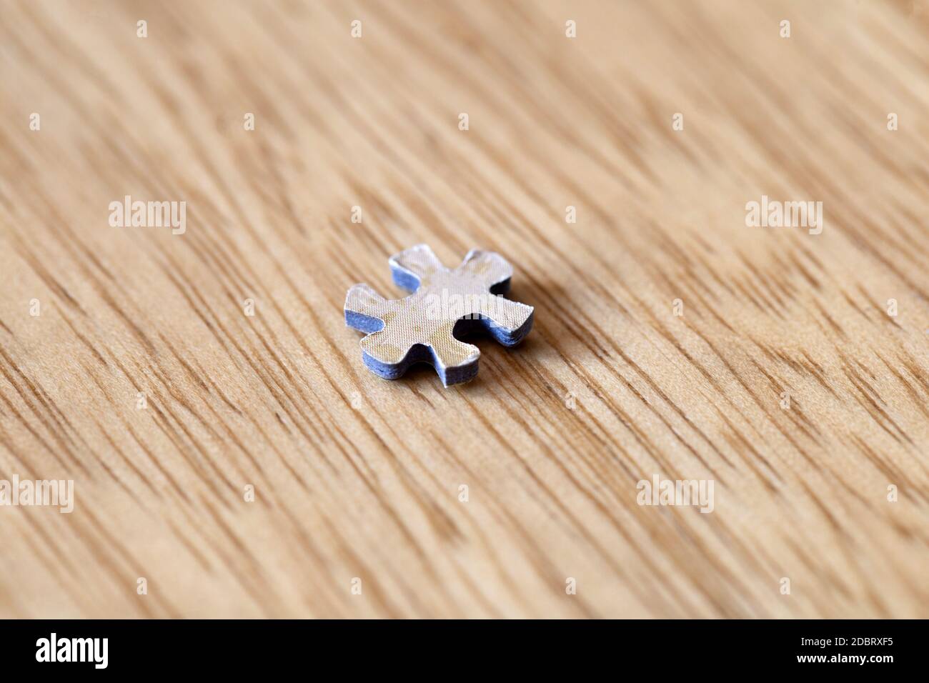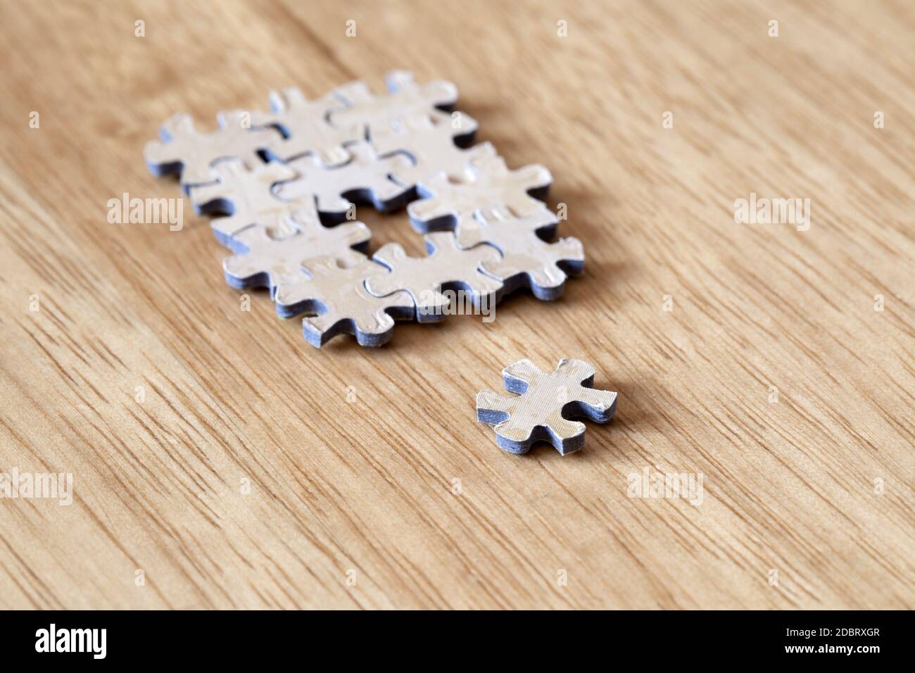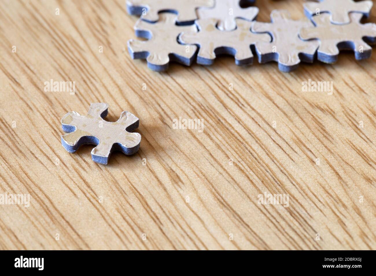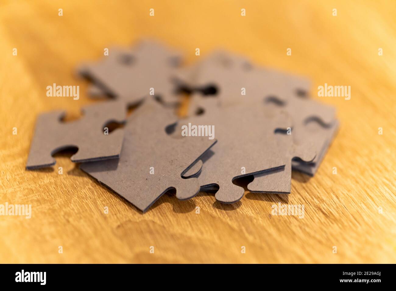 Selective focus shot of blank puzzle pieces on a wooden surface Stock