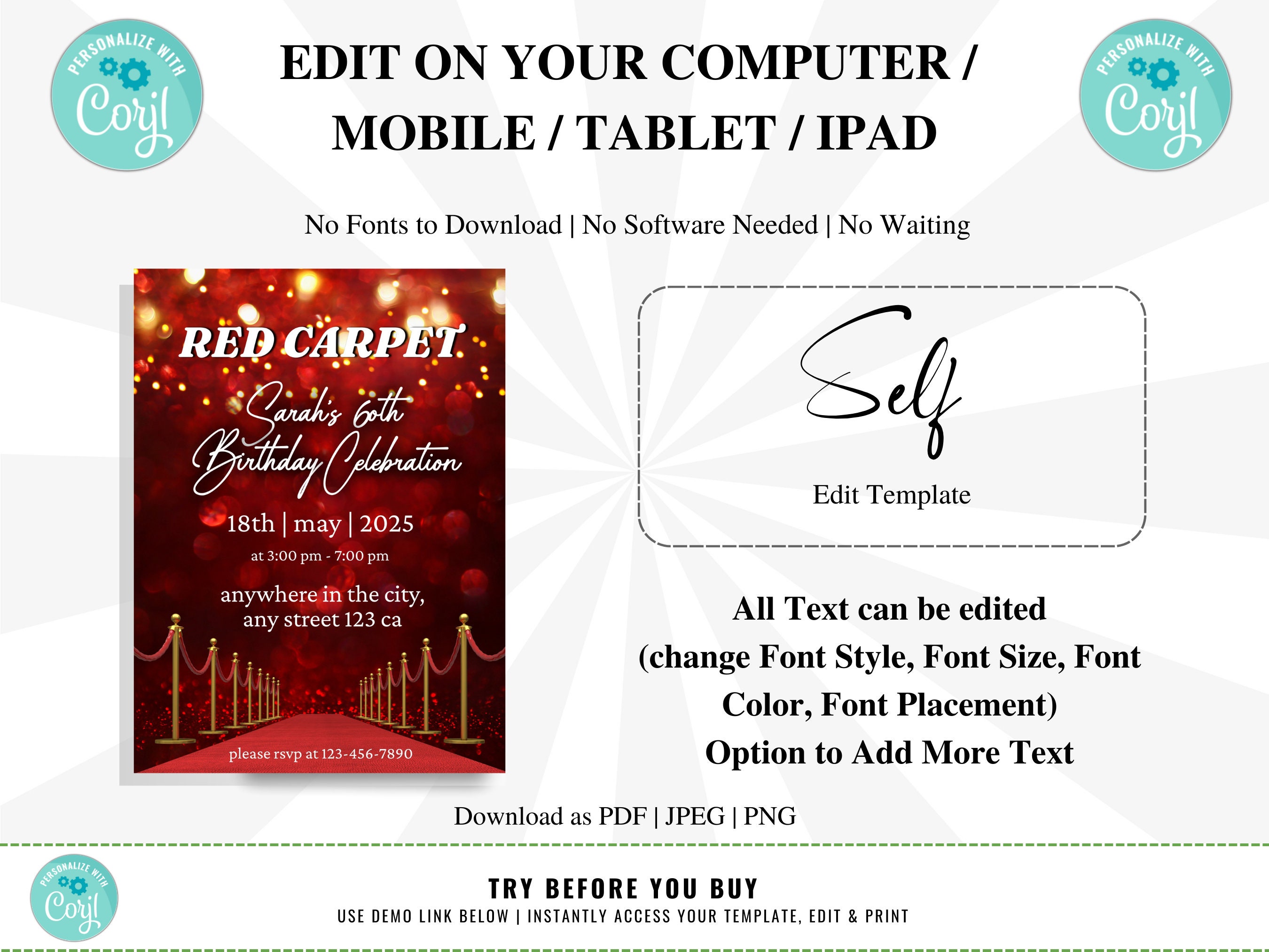 Printable Red Carpet Invitation Template Hollywood Theme Etsy