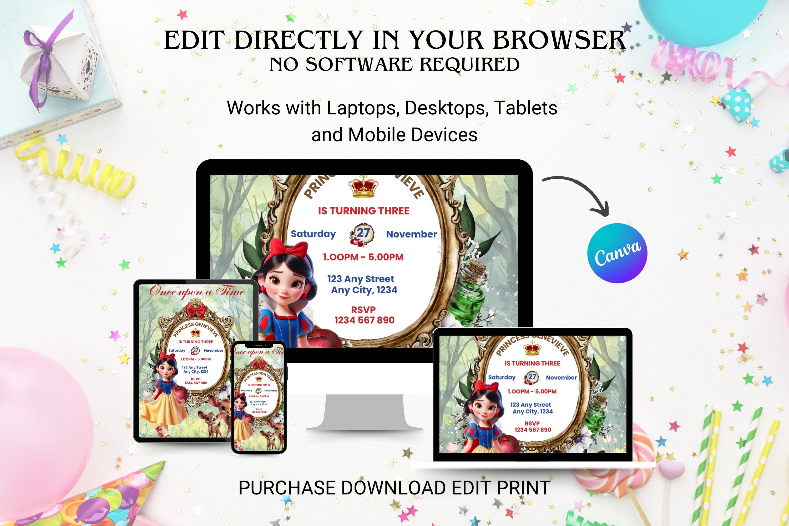 Snow White Birthday Invitation Snow Invite Fairytale Princess EDITABLE