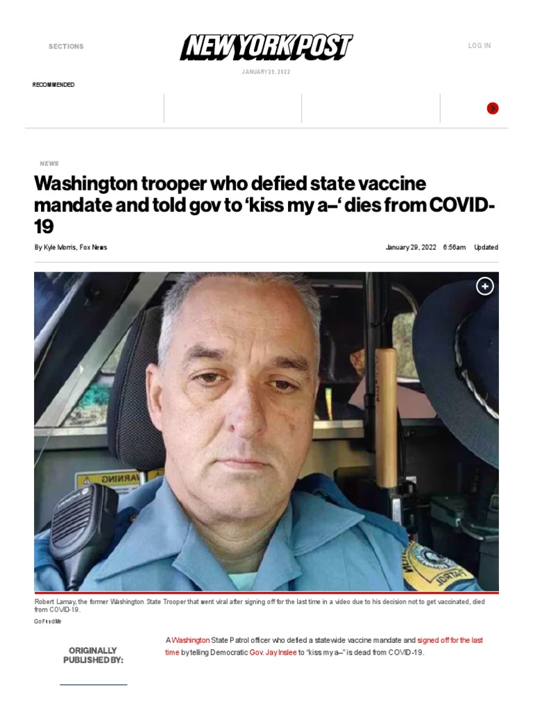 Washington Trooper Robert LaMay Who Defied State Vaccine Mandate Dies