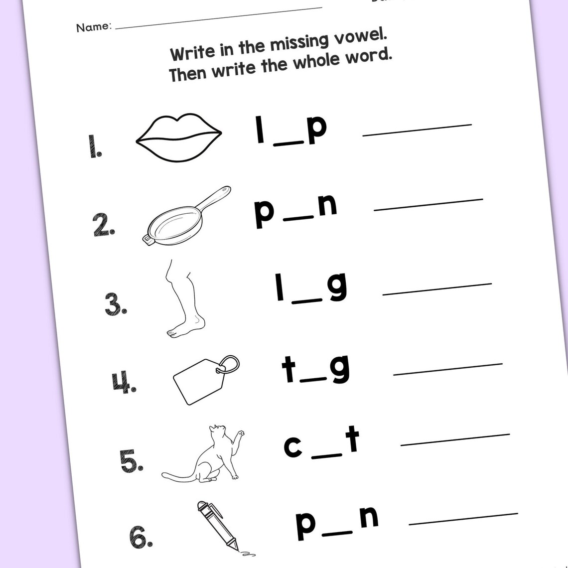 CVC Blending Segmenting Worksheets Printable CVC Missing Vowel Writing