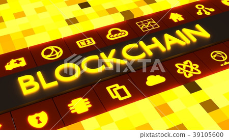 Yellow cube grid with the glowing word blockchain Stock Illustration