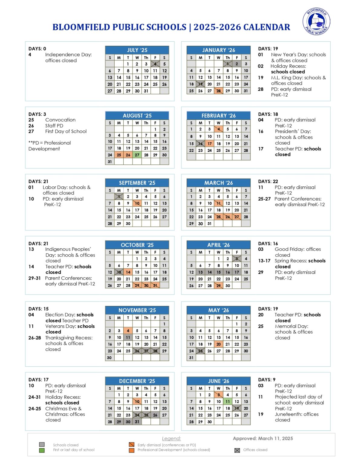 Bloomfield Public Schools Calendar 25 26 Revised PDF EduCounty