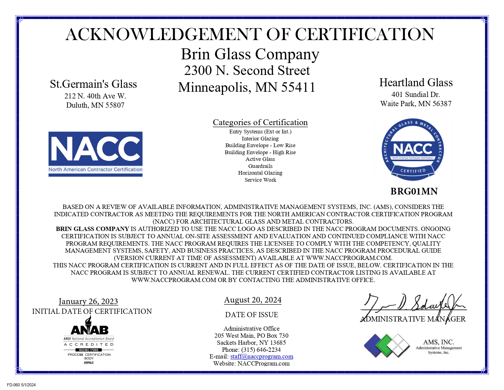 NACC Certification St Germain #39 s Glass Co Glass Services Duluth MN