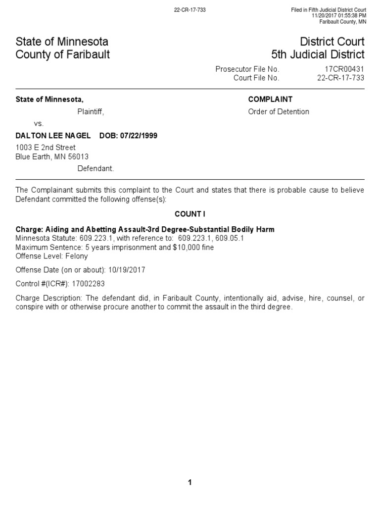 Complaint Against Dalton Nagel Blue Earth Area Schools PDF Arrest