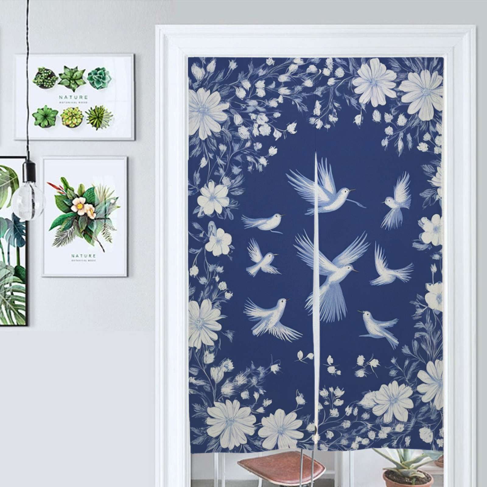 Blue Floral Bird Print Door Curtain Nordic Living Room DoorCurtain