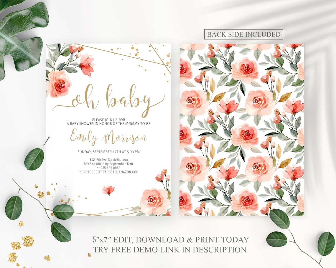 Pink Floral Oh Baby Invitation Template Editable Blush Pink Etsy