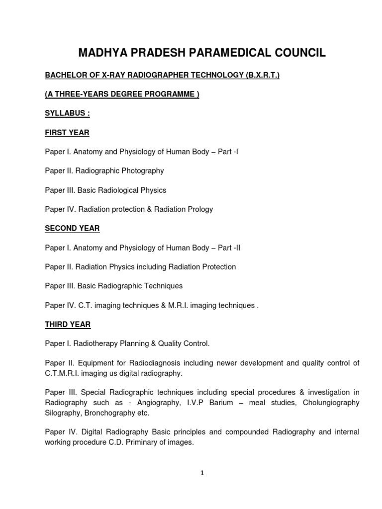 MP Paramedical Council BXRT Degree Syllabus PDF Radiography Ct Scan