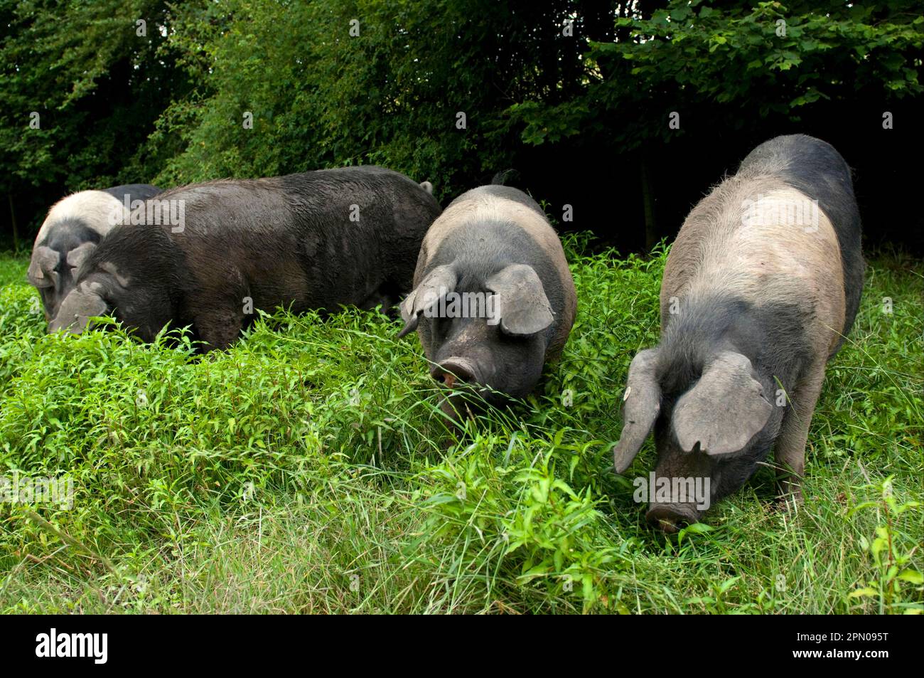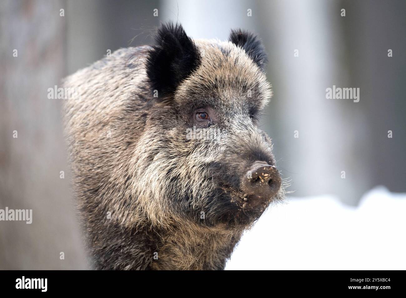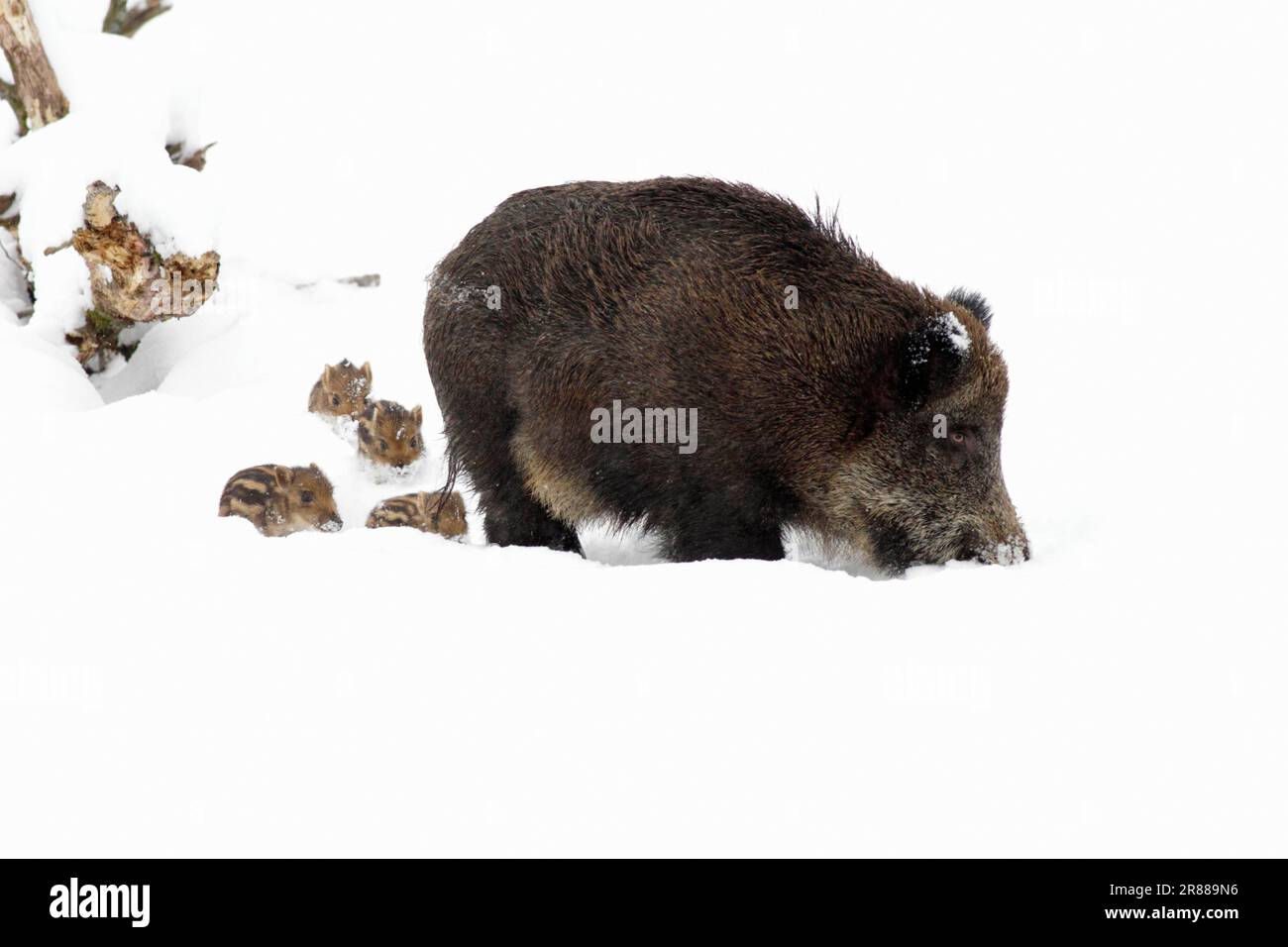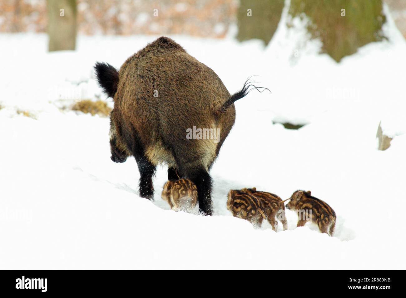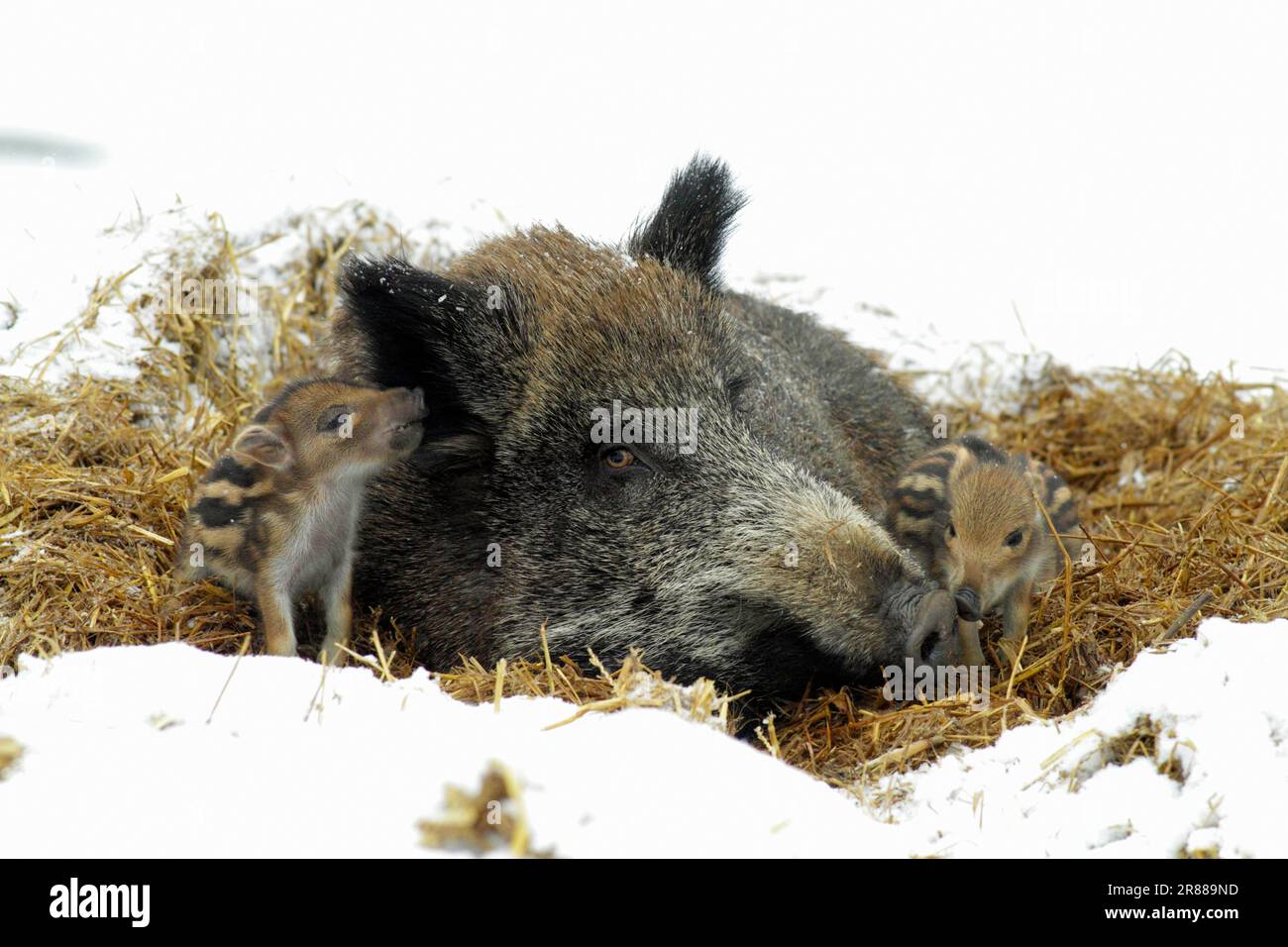 Wild boars (Sus scrofa) sows and young boars in the kettle Stock Photo