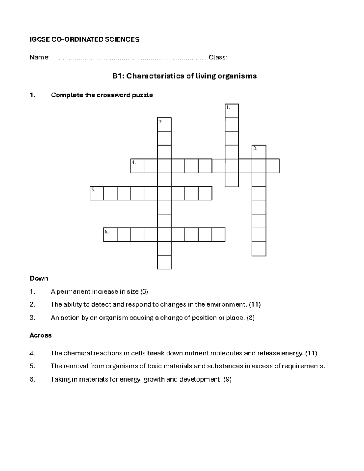 IGCSE B1: Characteristics of Living Organisms Crossword Puzzle Studocu