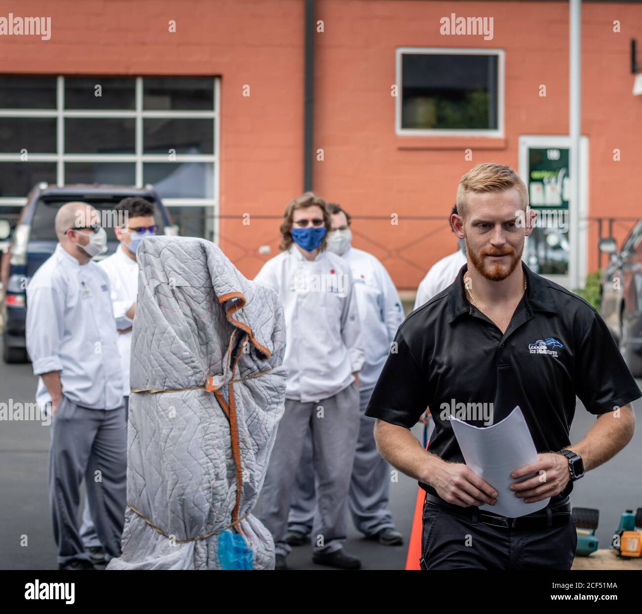 Student ice carver sculpting block of ice with electric chainsaw in ice