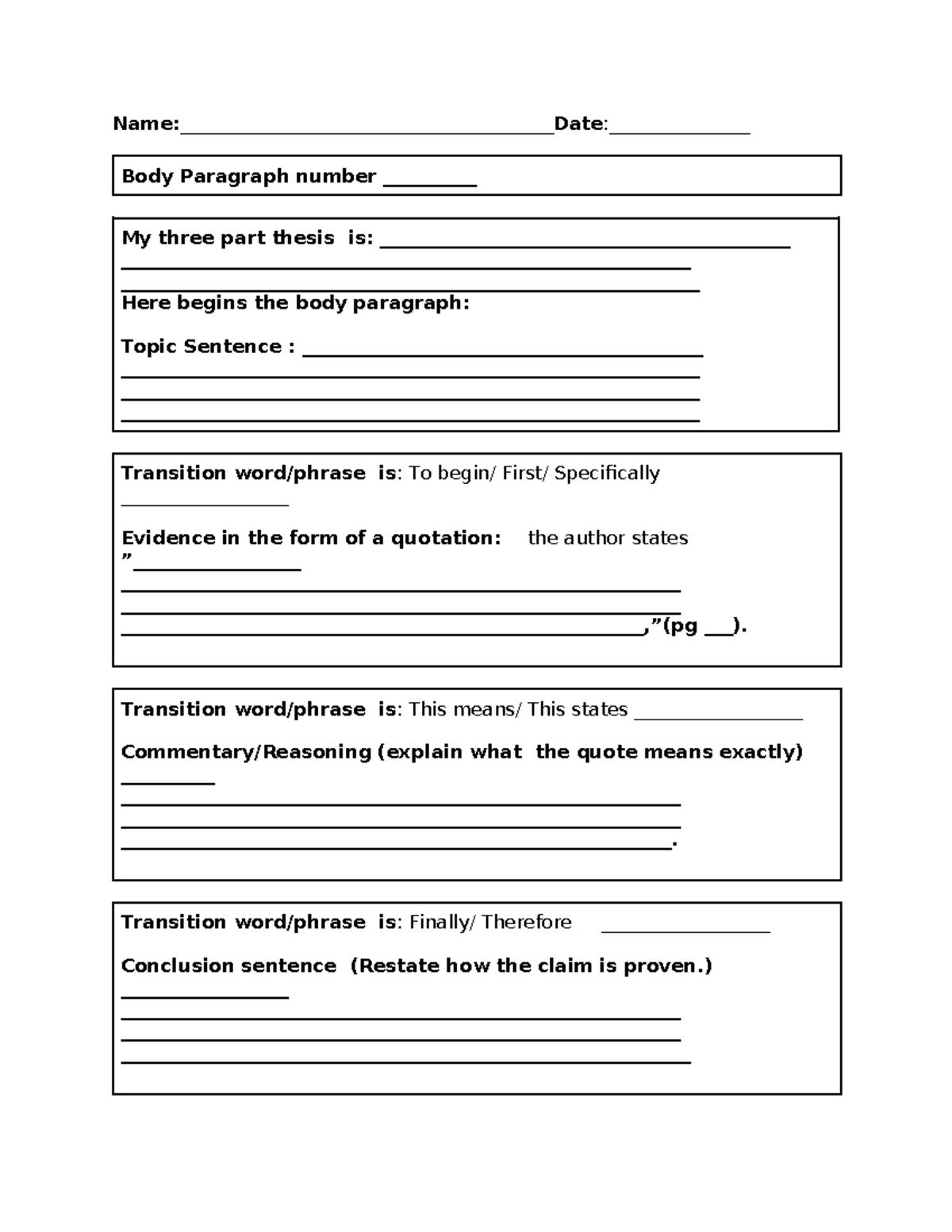 Body paragraph template Name: Date: Body Paragraph number