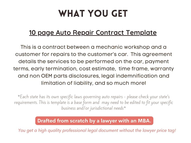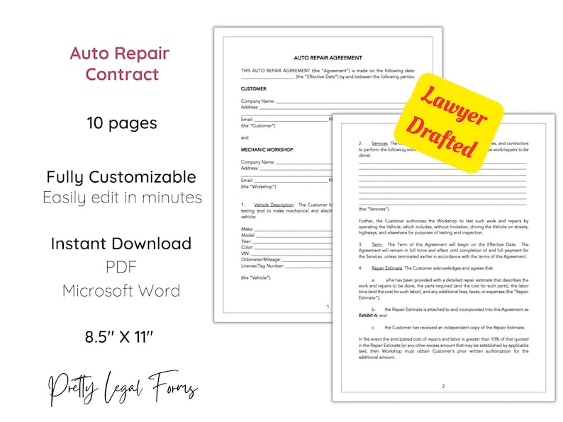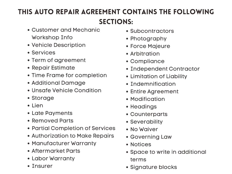 Auto Repair Agreement Editable Template Contract Agreement Contract