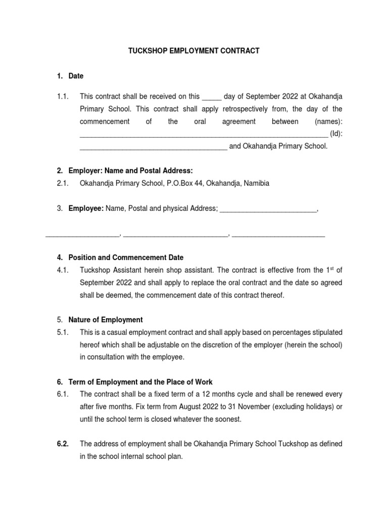 Okahandja Primary School Tuckshop Employment Contract PDF