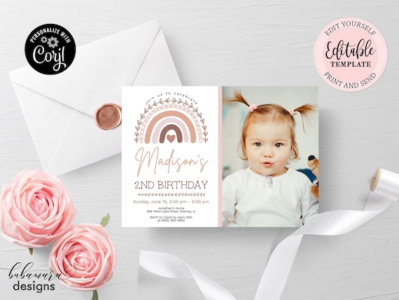 Editable Boho Rainbow Birthday Invitation with Photo Girl Pastel