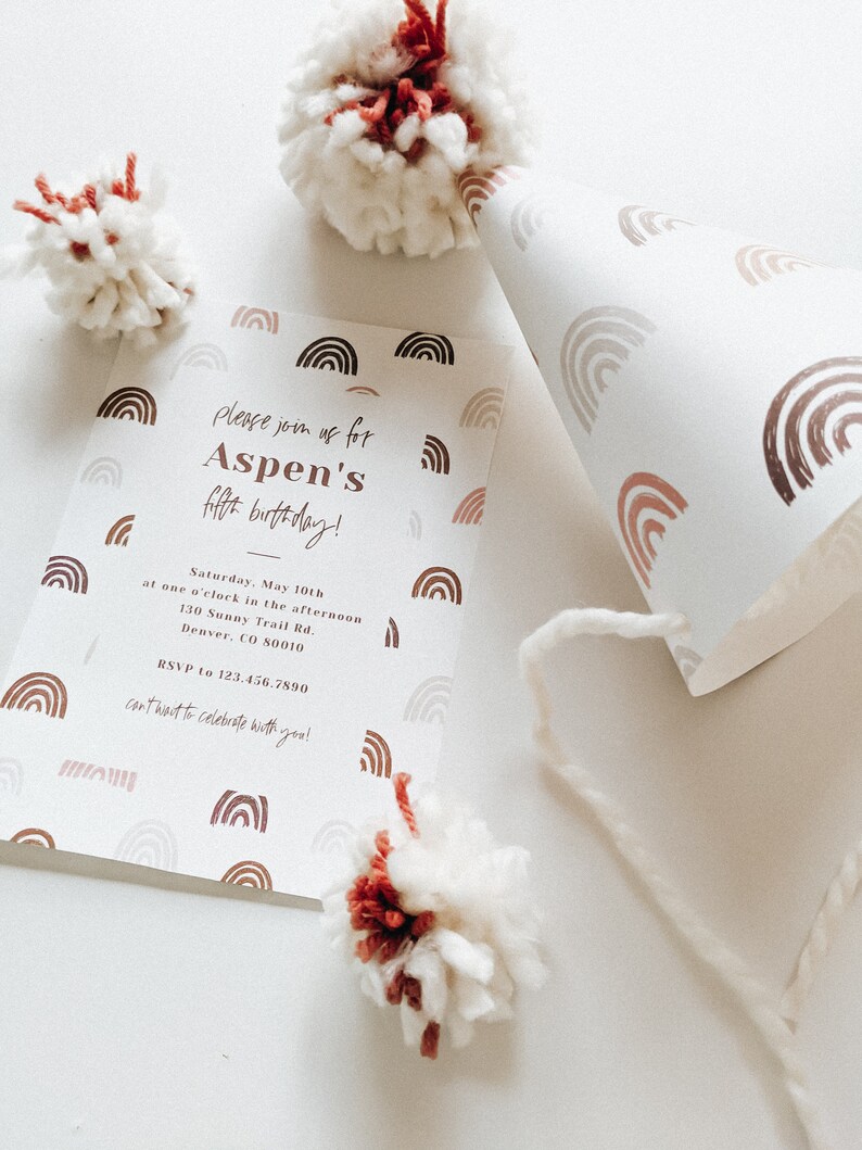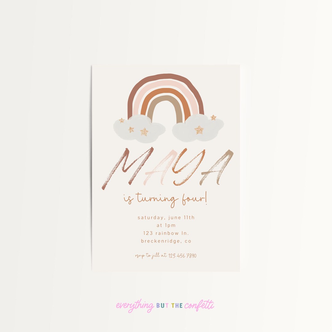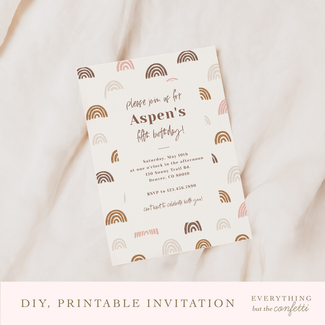 Printable Boho Rainbow birthday invitation Neutral rainbow Over the