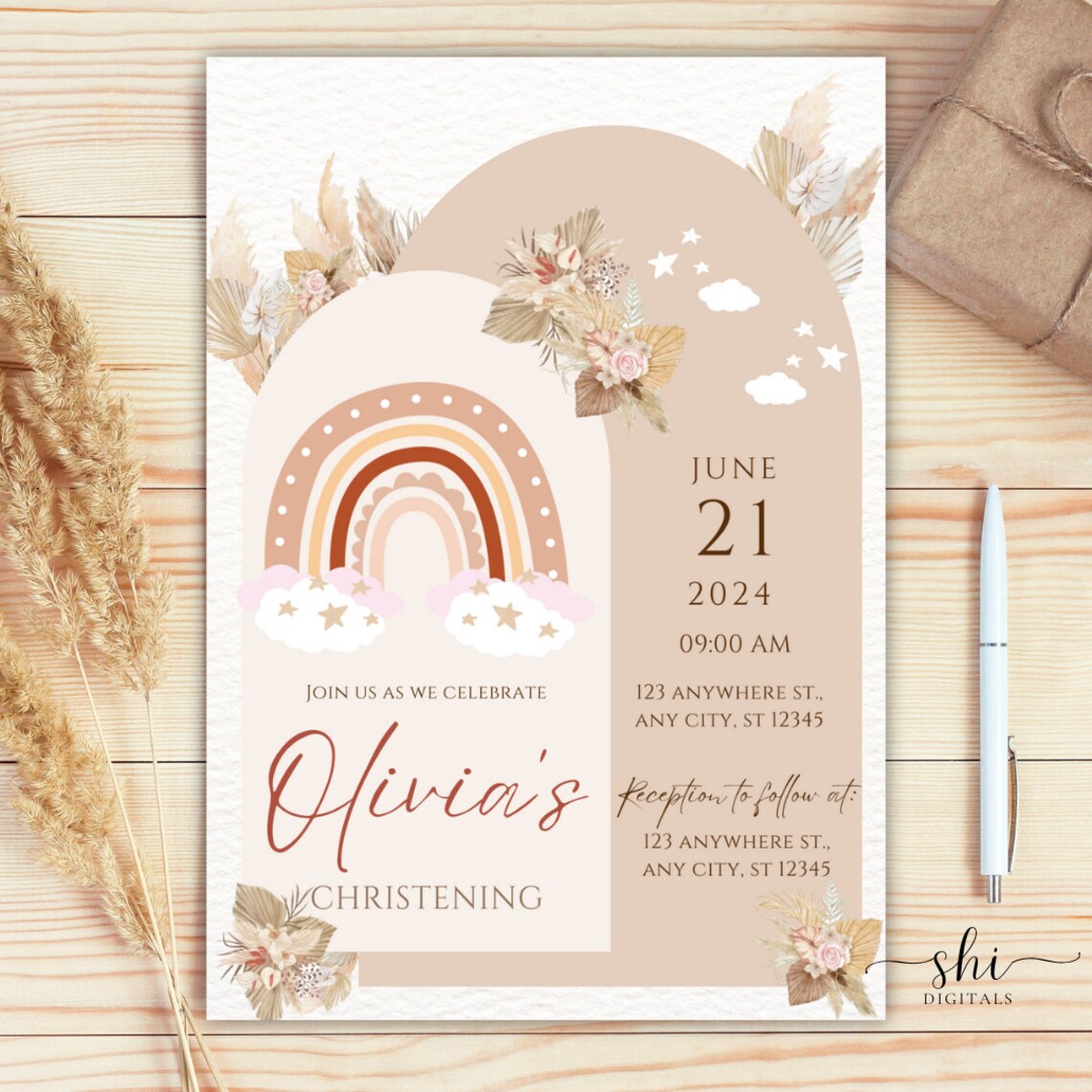 Editable Boho Rainbow Baby Shower Invitation Pink Pampas Grass Boho