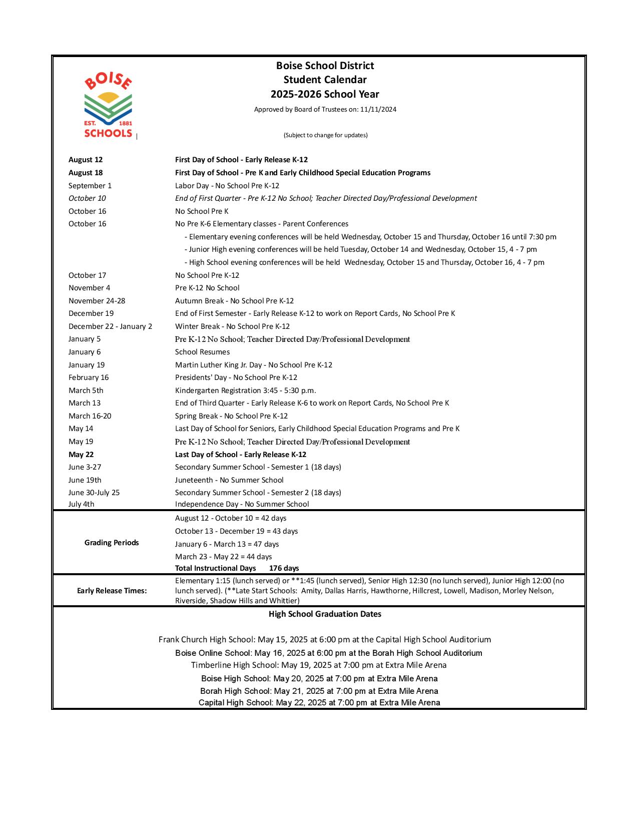 Boise School District Calendar 2025 2026 Holidays