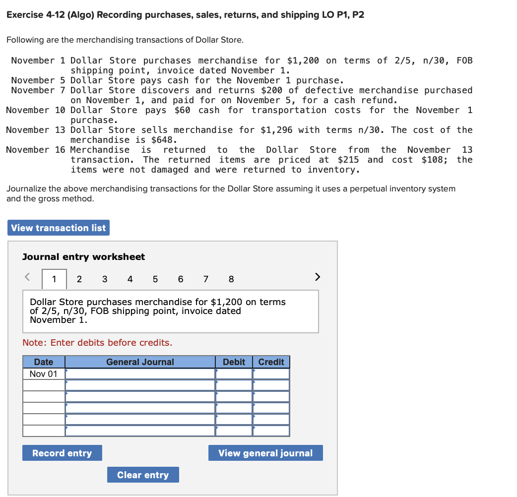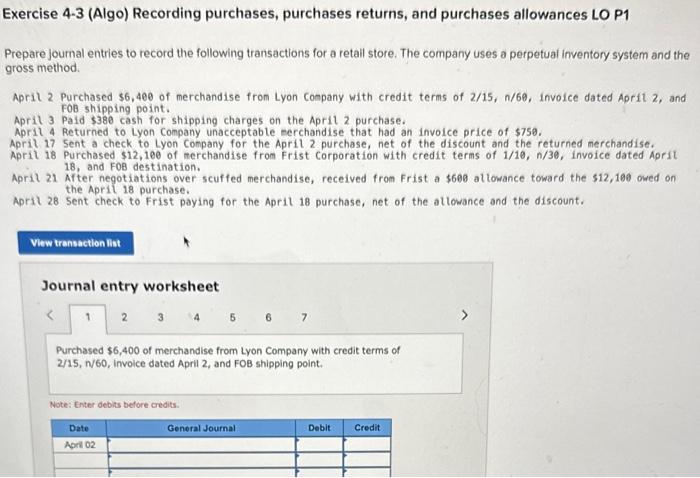 Solved Exercise 4 12 (Algo) Recording purchases sales Chegg com