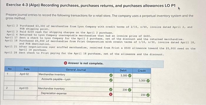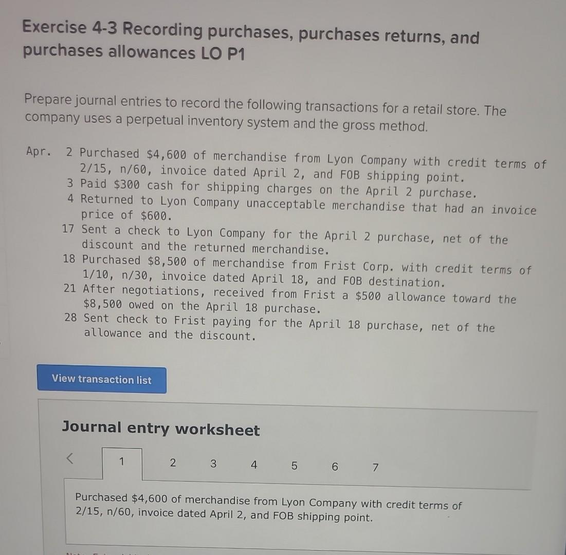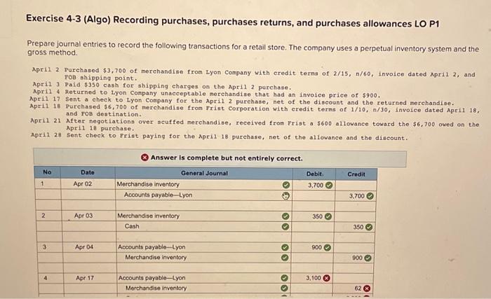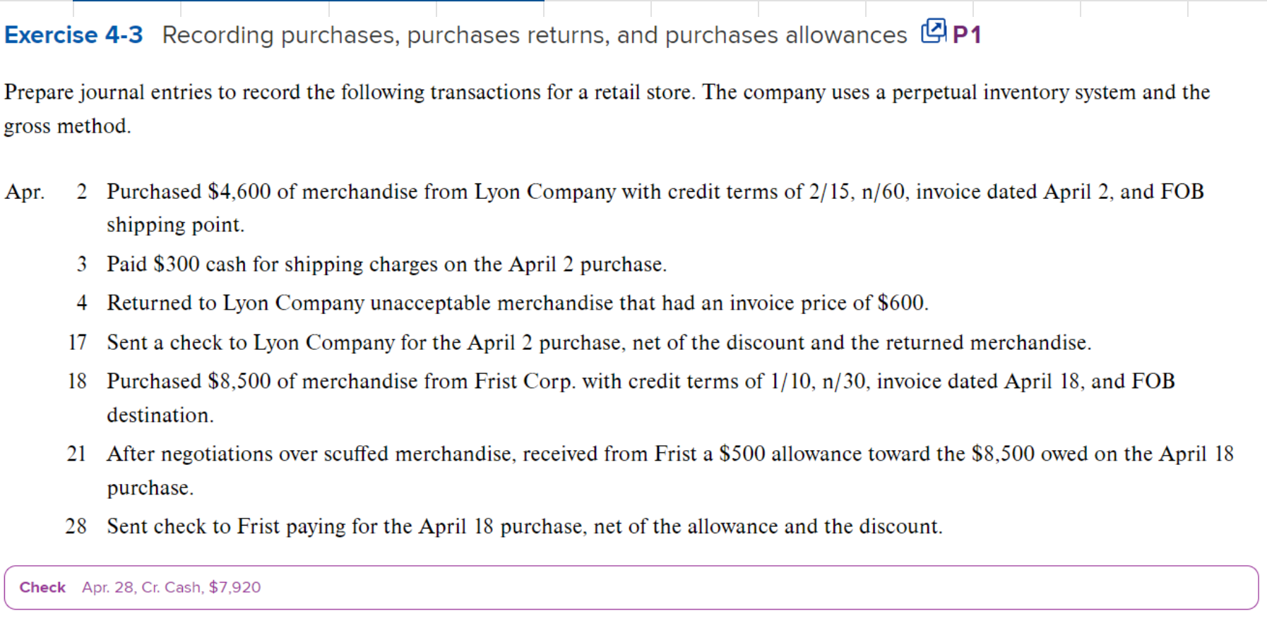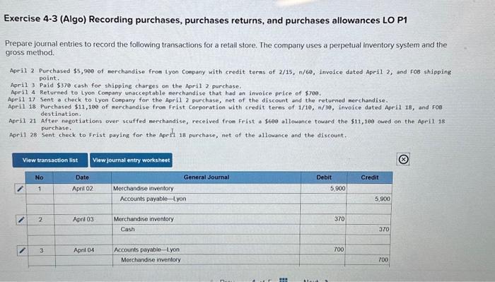 Solved Exercise 4 3 Recording purchases purchases returns Chegg com