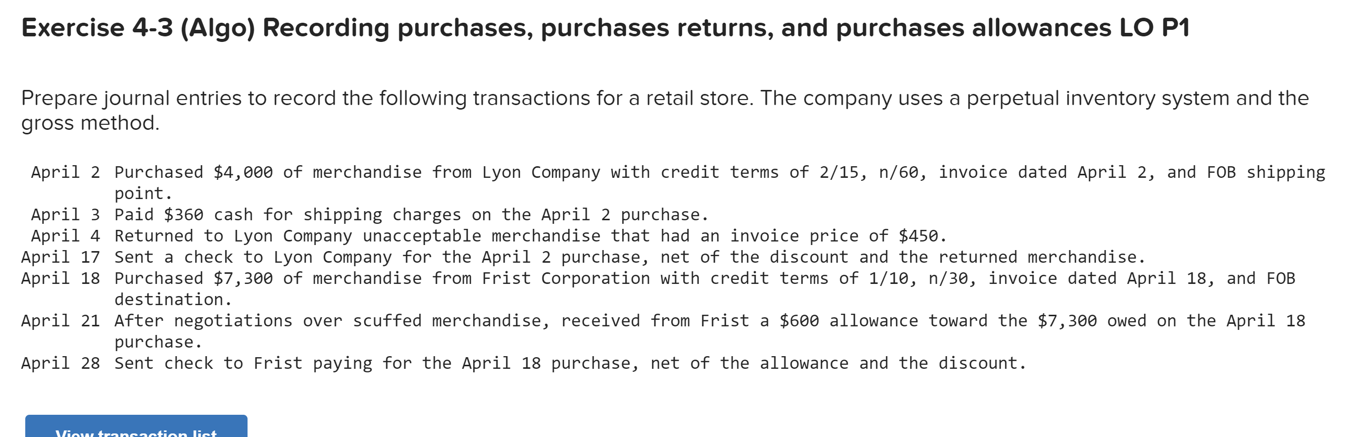 Solved Exercise 4 8 (Algo) Recording purchases purchases Chegg com