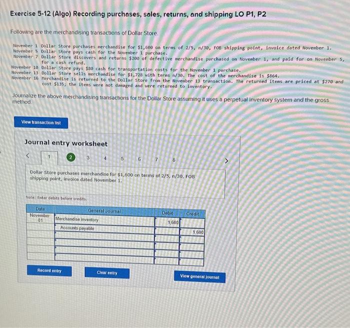 Solved Exercise 5 12 (Algo) Recording purchases sales Chegg com