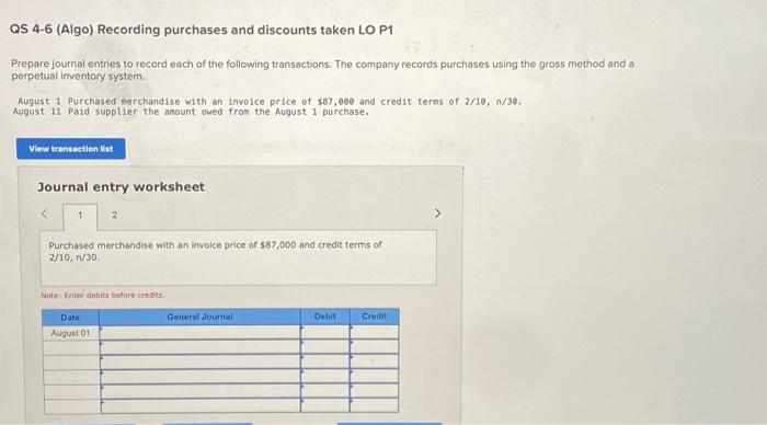 Solved QS 4 6 (Algo) Recording purchases and discounts taken Chegg com