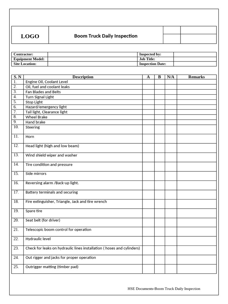 Boom Truck Inspection Checklist Fill and Sign Printable Template Online