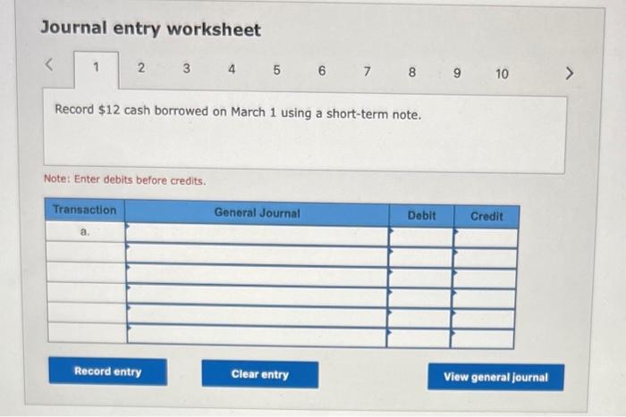 Solved Journal entry worksheet Record $12 cash borrowed on Chegg com