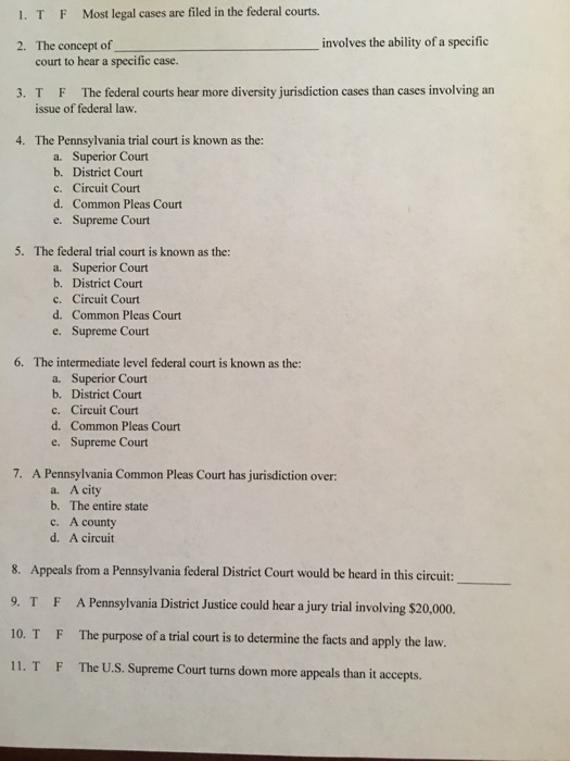Solved 1 T F Most legal cases are filed in the federal Chegg com