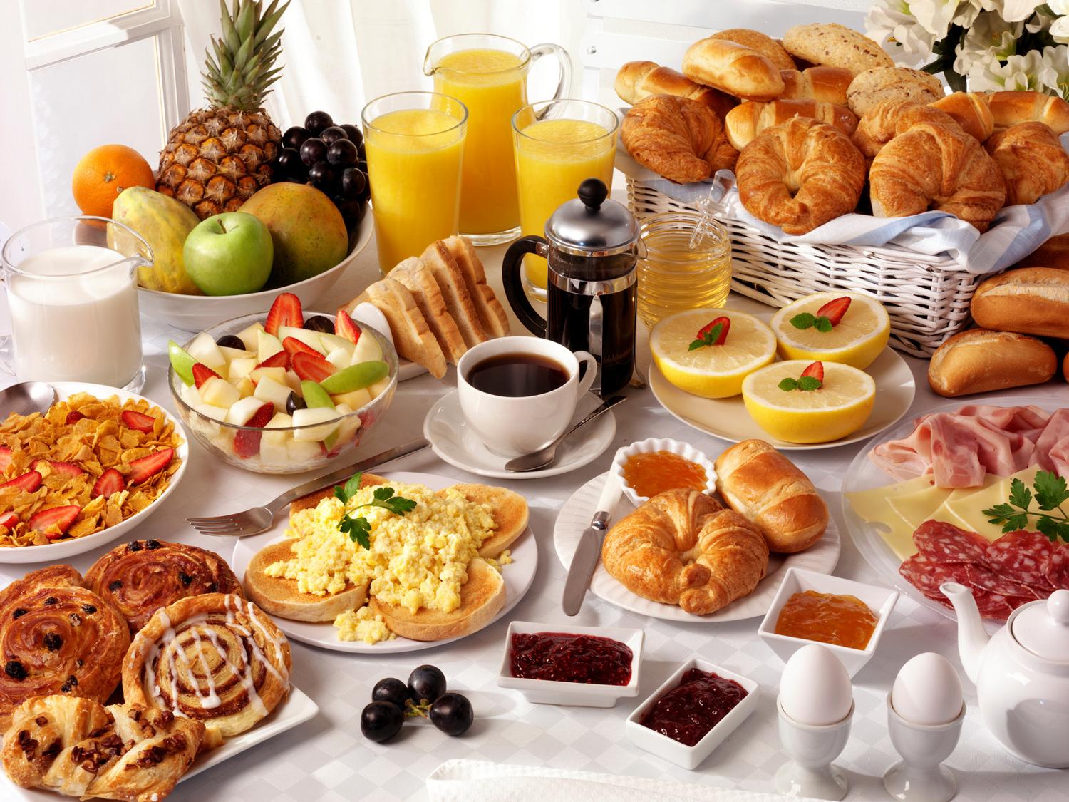 Huge Healthy Breakfast on Table with Coffee Orange Juice Fruits