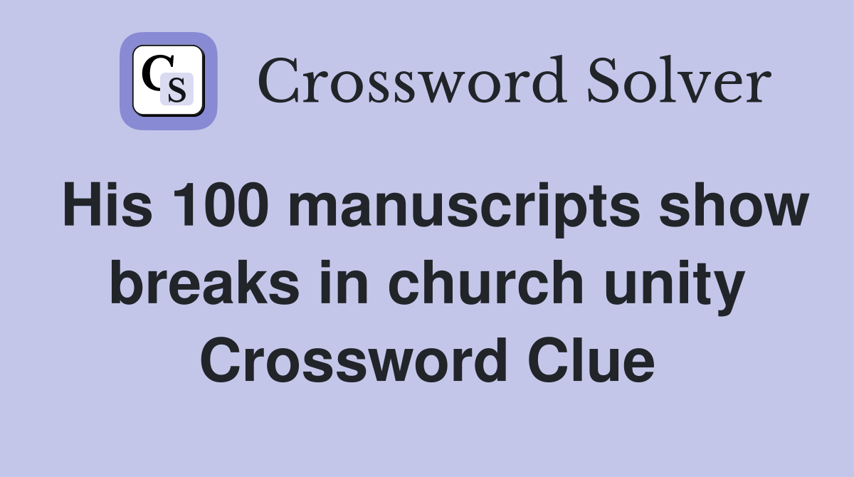 His 100 manuscripts show breaks in church unity Crossword Clue