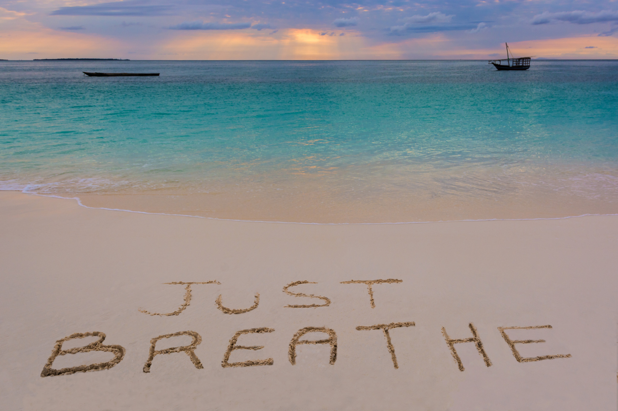 Handwritten Breathe deeply on sandy beach at sunset relax and summer