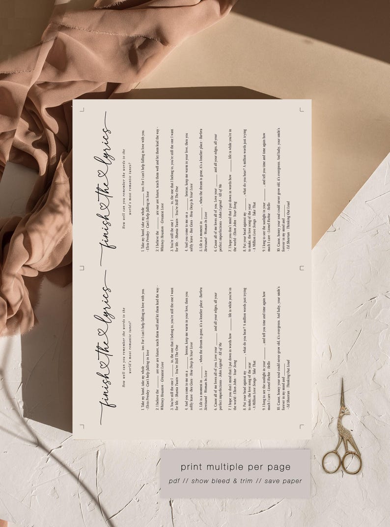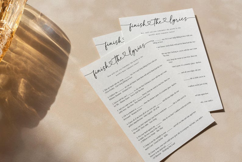 Finish the Lyrics Bridal Shower Game Music Bachelorette Party Game