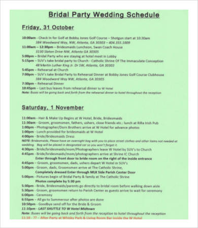 Bridal Party Schedule Template