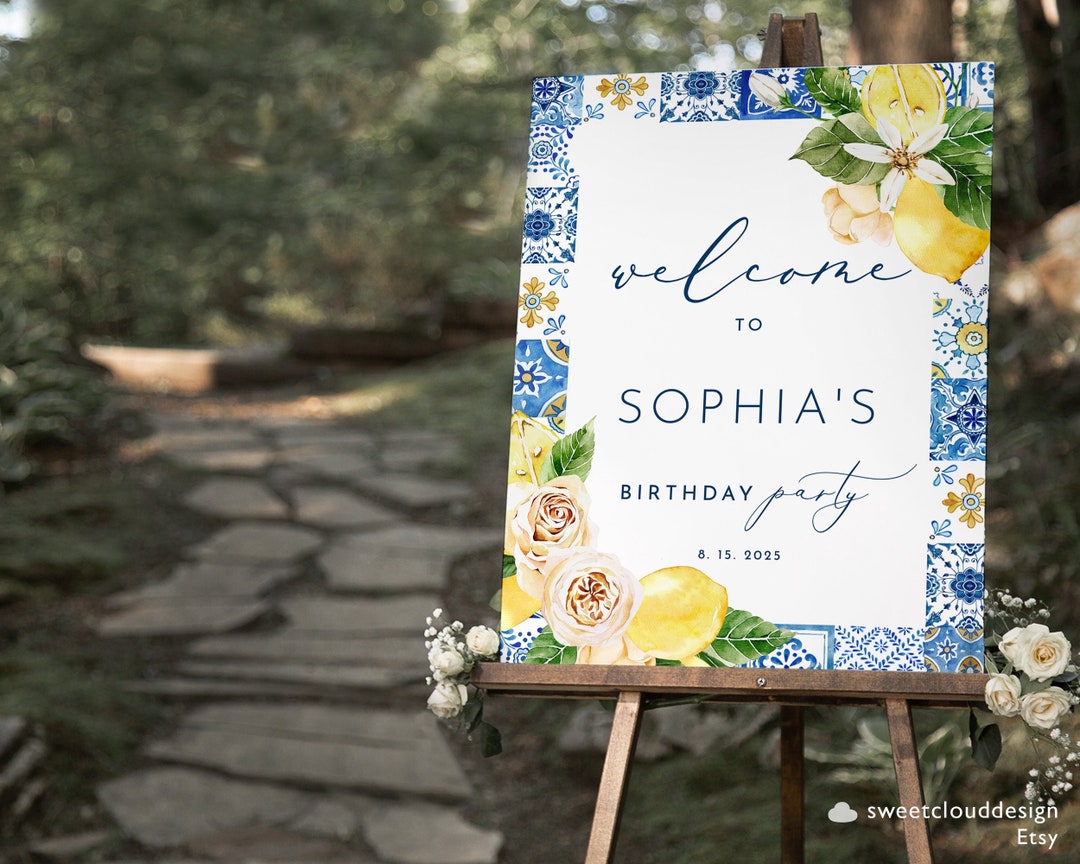 Blue Tile and Lemon Bridal Shower Welcome Sign Peach Rose and Lemon