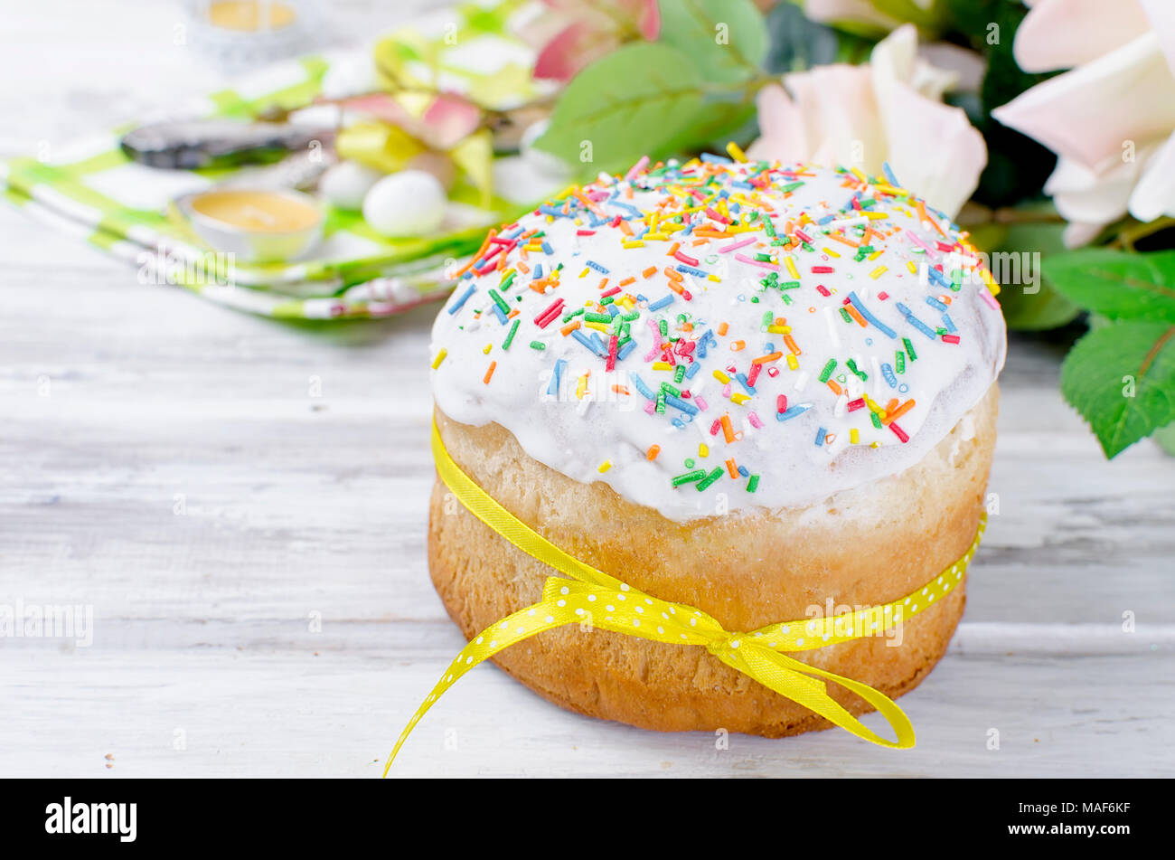 Easter cake with colorful topping and Place setting for Easter on the