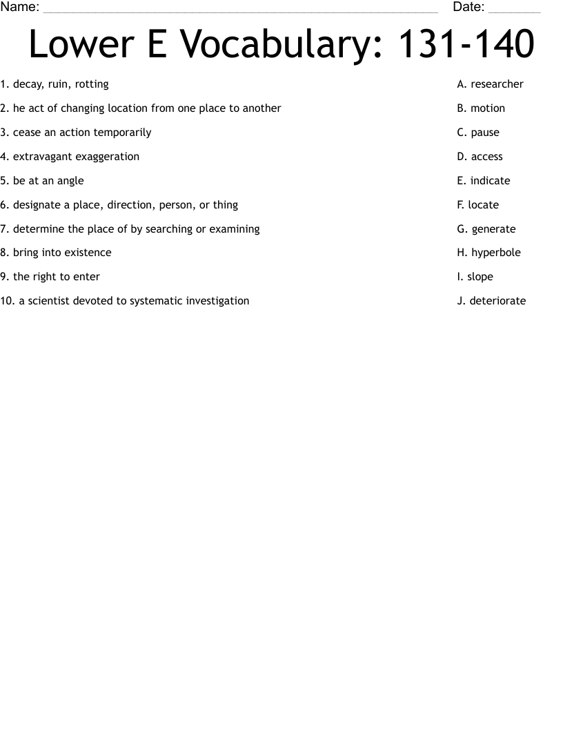 Lower E Vocabulary: 131 140 Worksheet WordMint