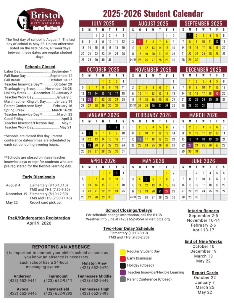 Bristol Tennessee City Schools Calendar 2025 2026 in PDF