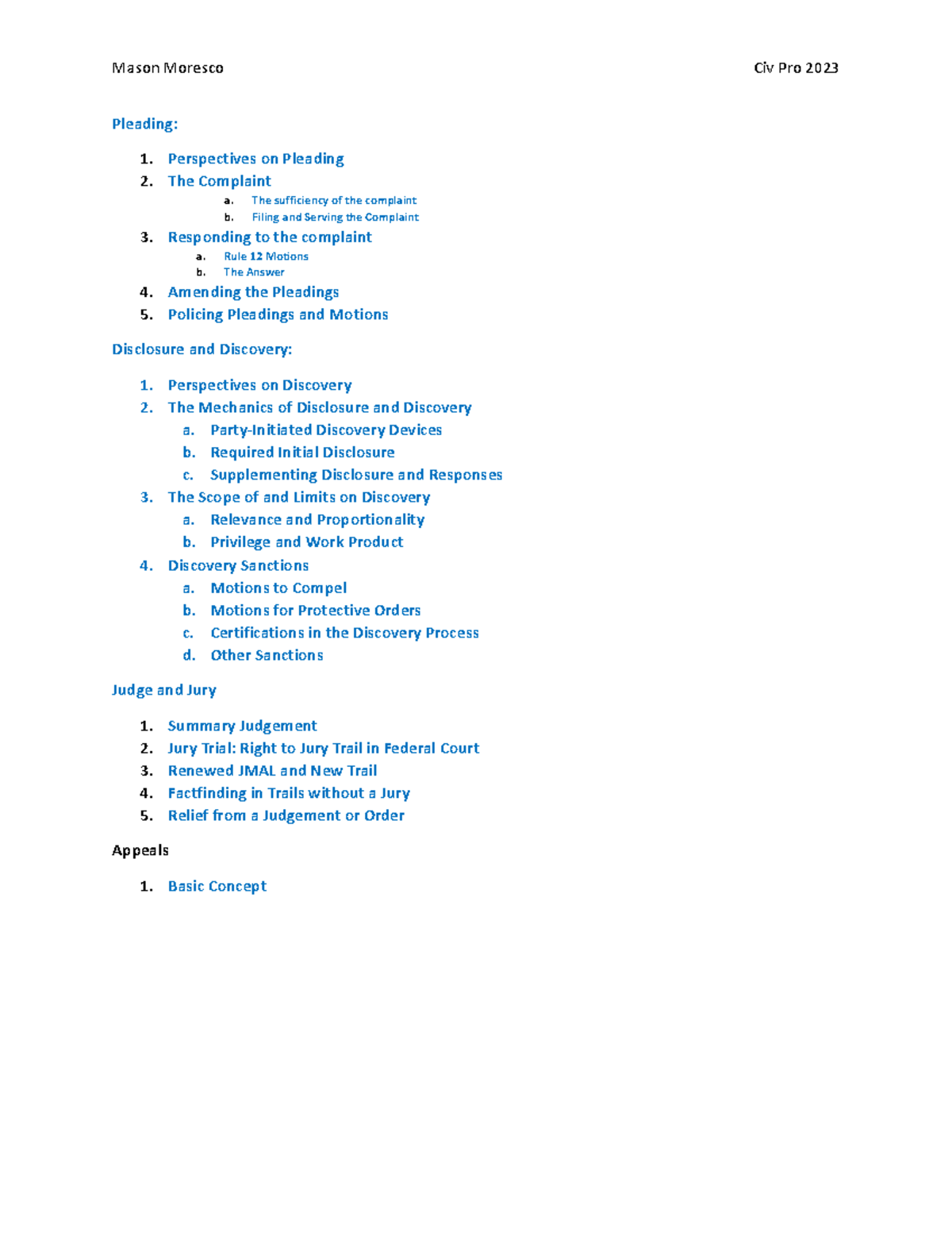 Civ Pro Outline 2023 1/2 Course Notes Pleading: 1 Perspectives on