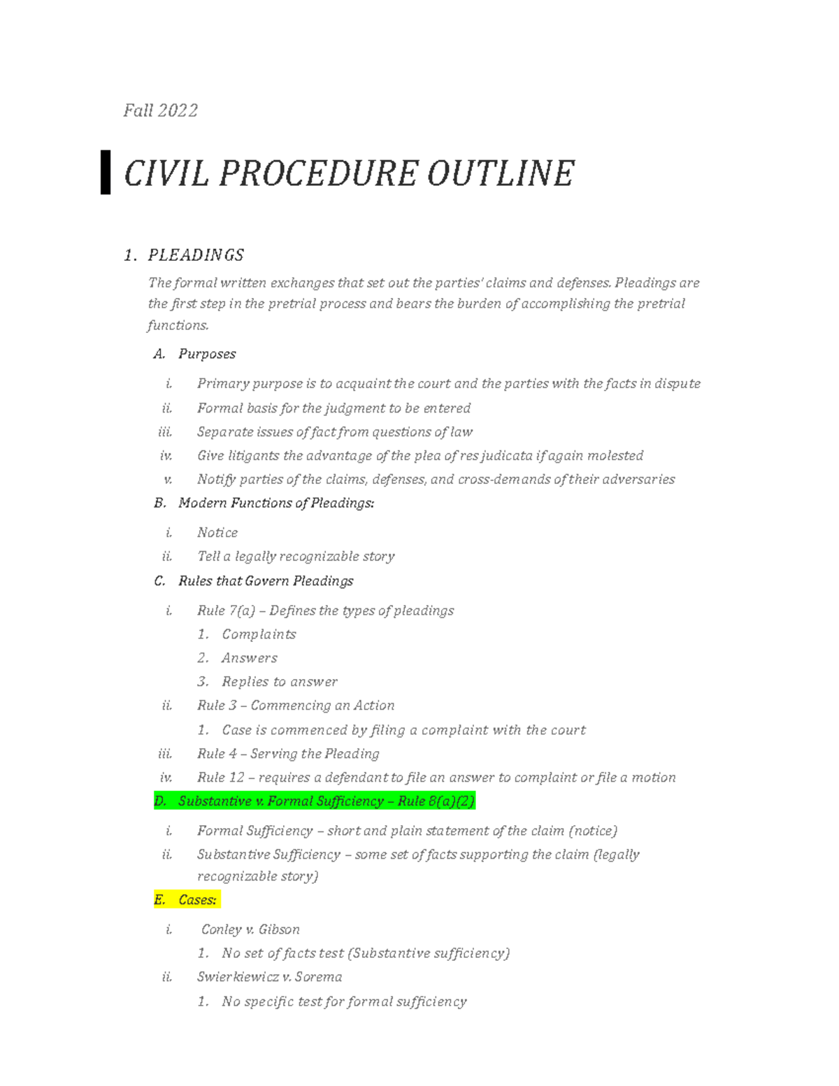 Civil Procedure Outline Fall 2022 CIVIL PROCEDURE OUTLINE 1